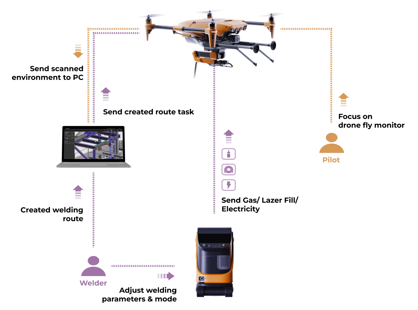 Infinity X welding system involves the coordination of two operators. The first operator, the Drone Pilot, focuses on flying the drone to the target location. The second operator, the Welder focuses on creating welding task. Meanwhile, the weld platform car sends the necessary gas, laser filler, and electrical power to the drone for welding.